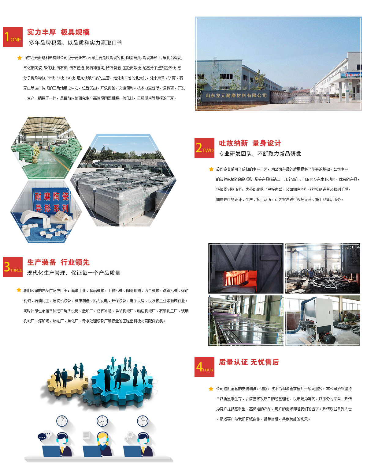 山東龍?jiān)湍ゲ牧嫌邢薰疚挥诘轮菔校局饕且?a href="/">鑄石板、氧化鋁陶瓷、三合一陶瓷復(fù)合襯板、陶瓷復(fù)合板、碳化硅、壓延微晶板、鑄石沖渣溝、氧化鋁陶瓷管道、氧化鋁陶瓷彎頭、三合一復(fù)合陶瓷板、鑄石管道、鑄石彎頭、氧化鋁陶瓷片、超高分子量聚乙烯板、三合一復(fù)合陶瓷板等產(chǎn)品為主營(yíng),地處山東省的北大門(mén),處于京津、濟(jì)南、石家莊等城市構(gòu)成的三角地帶之中心,位置優(yōu)越、環(huán)境優(yōu)雅、交通便利。技術(shù)力量雄厚,集科研、開(kāi)發(fā)、生產(chǎn)、銷(xiāo)售于一體,是目前內(nèi)地研究生產(chǎn)高性能陶瓷耐磨,碳化硅,工程塑料等規(guī)模大的廠(chǎng)家之一。公司設(shè)備采用了成熟的生產(chǎn)工藝,為公司產(chǎn)品的質(zhì)量提供了堅(jiān)實(shí)的基礎(chǔ)。